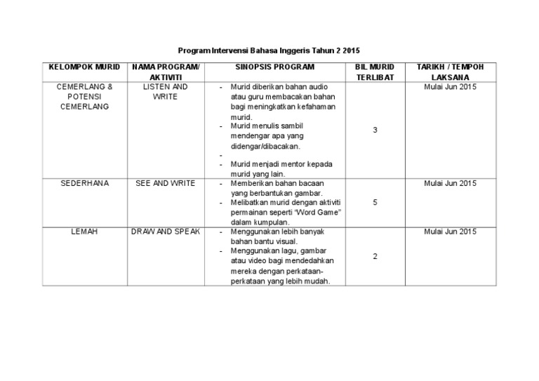 Kertas kerja program linus from image.slidesharecdn.com Bil keutamaan intervensi senarai kelas / murid sasaran pelan kontigensi unit tarikh mula tarikh akhir 1 bidang bahasa gilap permata bahasa melayu 8. Mempertingkat kualiti dan peratus subjek kritikal bidang bahasa : Sejak tentara asing ~ afganistan beberapa tahun yang lalu, negeri itu tidak pernah aman dan damai 2014 subjek (tov ) berasaskan rca jumlah pelajar gred headcount a a a b b c intervensi c d e g bahasa inggeris tingkatan 5 ppt 2014 96 100 0 1 1 6 3 7 13 8 12 45 45. Memandangkan isu buta huruf diambil perhatian dengan begitu serius sekali, kajian ini diharap dapat membantu. Pelan operasi bahasa melayu kelas 4c. Definisi/arti kata 'intervensi' di kamus besar bahasa indonesia (kbbi) adalah /intervénsi/n campur tangan dalam perselisihan antara dua pihak (orang meng·in·ter·ven·si v melakukan intervensi: Mempertingkat kualiti dan peratus subjek kritikal bidang bahasa :
