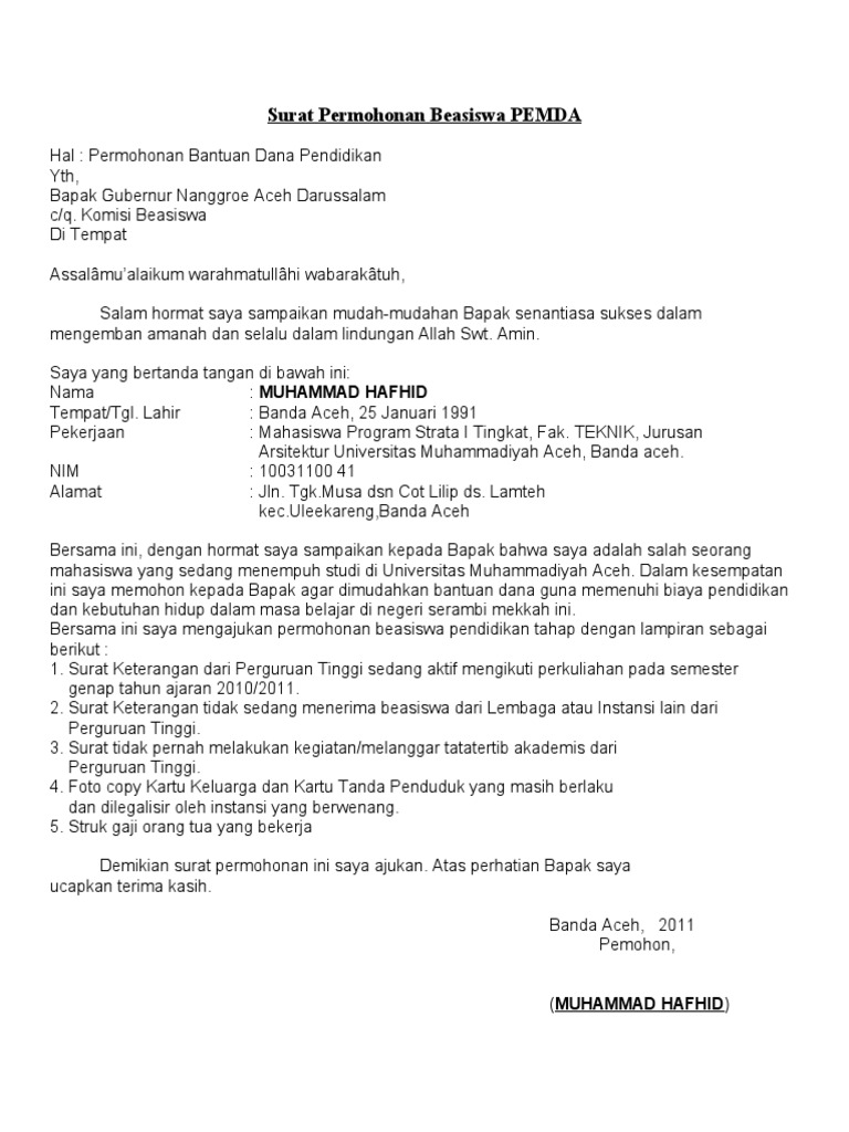 Contoh surat permohonan beasiswa pendidikan.