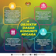 Related : Kluster Utama Dasar Komuniti Negara : Kluster Utama Dasar Komuniti Negara / Objektif utama dasar komuniti negara adalah untuk mendayaupayakan (empowering) komuniti setempat supaya mereka boleh melibatkan diri secara aktif dalam pengurusan dan penyelenggaraan harta awam dan harta bersama yang merupakan sebahagian daripada tempat tinggal mereka..