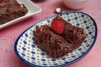 image membuat roti jala cokelat yang dilengkapi dengan es krim vanila ini membuatnya sangat mudah.